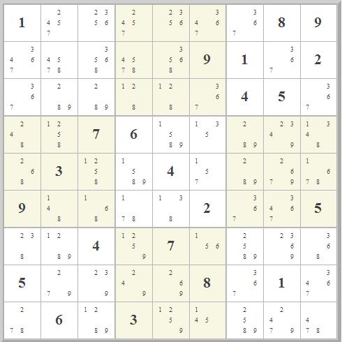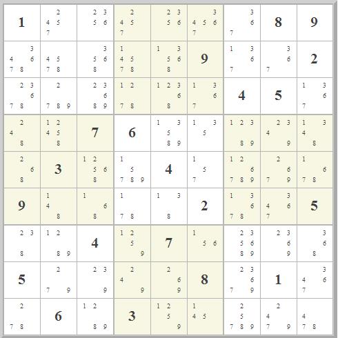 And, best of all, this reveals a 367 naked triple in Column 7. We can set r2c7=1. Now we are getting somewhere. | ||