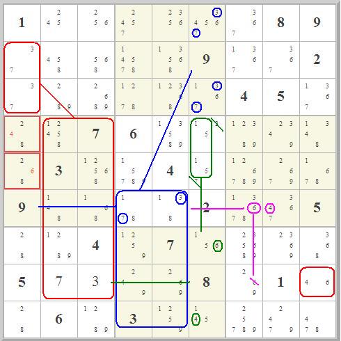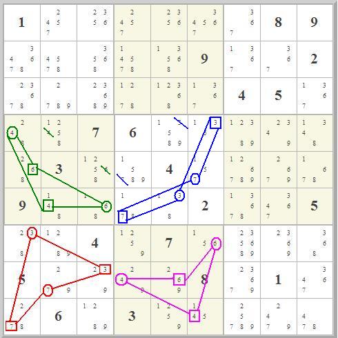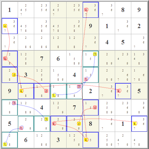 OK, now consider the alternative for this chain syncing: r8c2=7 and r6c4=7. The analysis is identical! Once again, the two 7s conspire to force 4 into r6c2, and the two 3s conspire to force 4 into r4c1. This proves that the two Medusa chains in Blocks 5 and 7 are synced as shown. A similar though more complex analysis involving almost-locked sets concludes that blocks 4 and 8 are also linked as shown. | ||