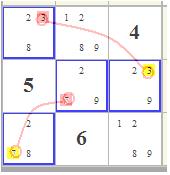 If you consider what is going on here, basically we are following chains of number pairs. The same analysis for the effect of having 3 and 7 in the first column of Block 7 proves equally impossible. You can follow the number pair chain yourself; it reveals a 29 naked pair in the center row of Block 7, which forces 4 and 6 into that row, leading up to a 46 naked pair in the third column of Block 2. Continued following of the naked pairs resulting from that leads to (in one analysis) three 18 naked pairs in Row 6. The logical result is that if 3 and 7 cannot both not be in the first column of Block 7 and, in addition, that 3 and 7 cannot both be in that column, then one of each of the 3 and 7 must be in the first column of that block. The result is that we have now synchronized the two strong chains in Block 7. Or, to put it another way, we have one 4-element strong chain (instead of two 2-element strong chains) in that block. | ||