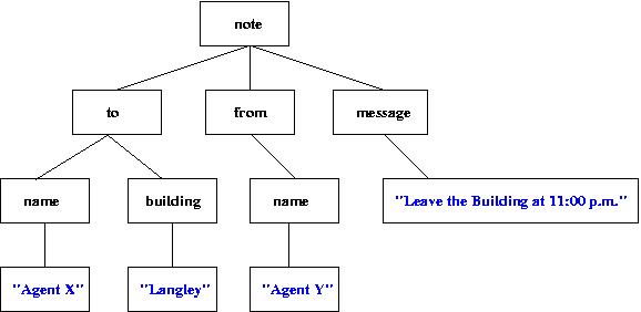 • Children -- In this XML document, every node is a child note with the exception of the root element note. Notice that the content of a node (e.g. "Agent X") is a child. The text nodes are colored blue in the diagram below. The best way to interpret parent and child is to draw a diagram of the DOM tree. It then becomes very clear.