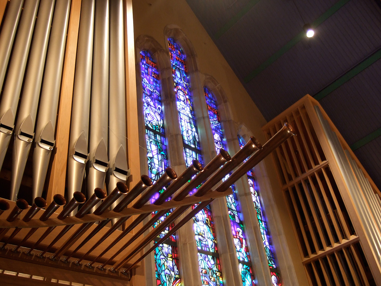 The transfiguration window in the rear gallery of Boe Memorial Chapel along with the Festival Trumpet of the Holtkamp organ.