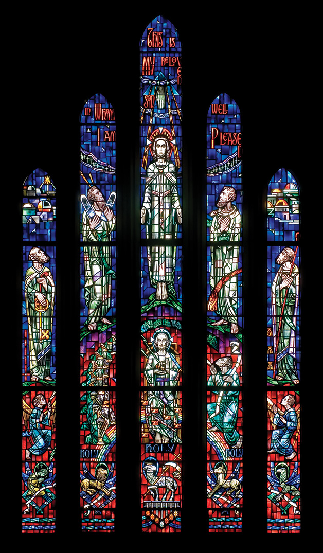 In this window, designed and completed by the Conrad Pickel Studio of Waukesha, Wisconsin, the fulfilled promises of the Old Testament are represented in the figures of Moses and Elijah, who flank Jesus, with Peter and James beside them and John below. The lower section of the window addresses the theme of the New Jerusalem, as mentioned in the Revelation of John. Depicted is the throne in heaven encircled by a rainbow, the elders with golden crowns, the seven lamps of fire and four beasts: the first like a lion, the second like a calf, the third with a face like a man and the fourth like an eagle, all saying “Holy, Holy, Holy.” The center lancet features the Lamb of God upon the book with seven seals described in Revelation. From the lamb, and the throne of God, runs the river of the water of life. To the right of the throne, holding a scroll, is St. John, author of the Apocalypse.